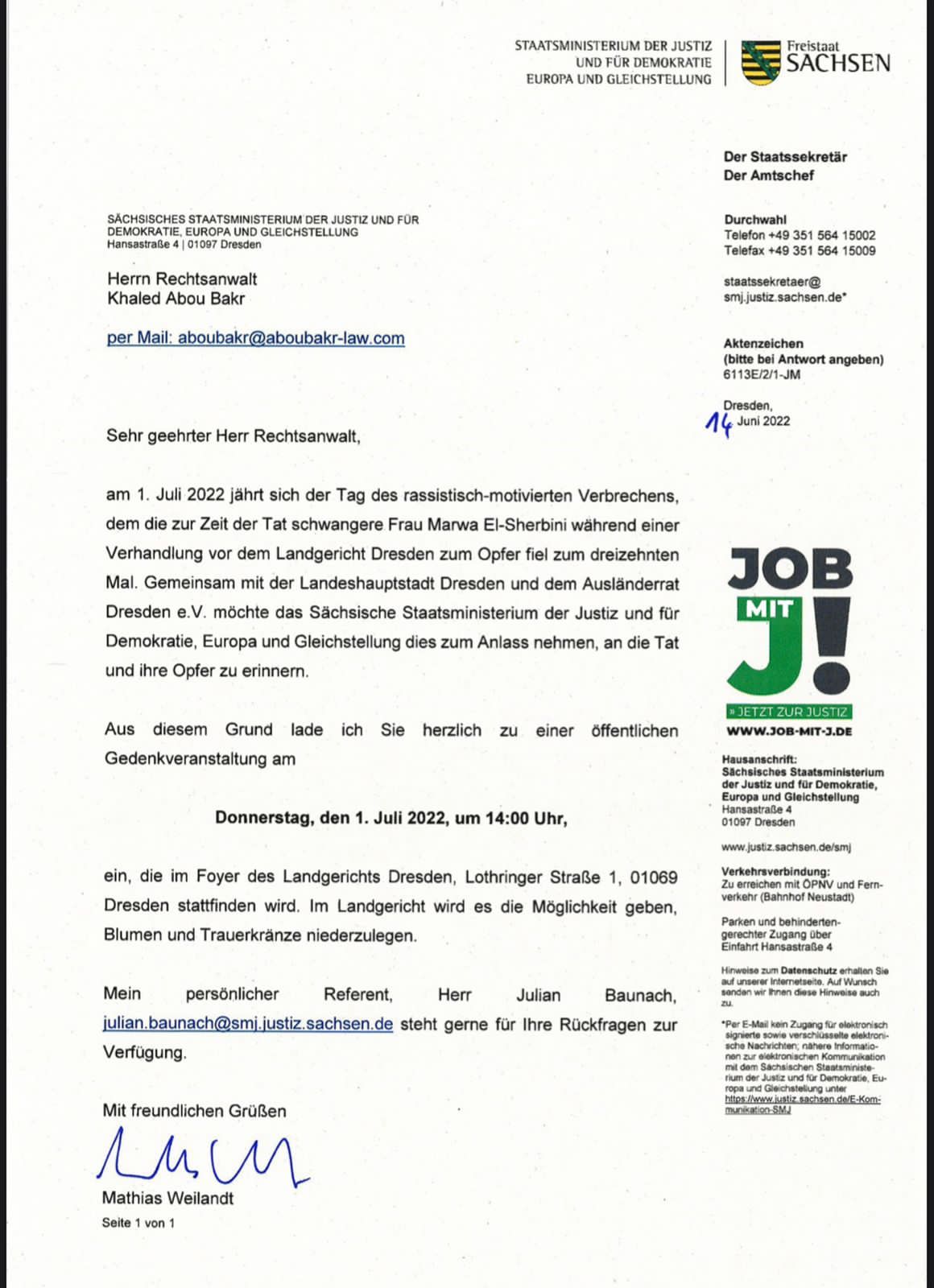 تلقي المحامي الدولي خالد ابوبكر دعوة رسمية من وزارة العدل بحكومة دريسدن الالمانية لحضور فعالية تنظمها ولاية ساكسوني وحكومة دريسدن ووزارة العدل والخارجية الالمانيه بمناسبة ذكري وفاة الطبيبة المصرية مروة الشربيني التي تعتبر المانيا ذكري وفاتها فرصة لنبذ العنصرية والتطرف ..