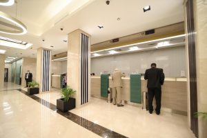 كما تم إعادة تصميم القبو الكبير بسقف صالة الفرع من خلال عمل تشكيلات مضيئة لتوحي في النهاية بالإضاءة الطبيعية، والتي اعتمد عليها في التصميم الأصلي للمكان ولتعطي للمكان ثراء وفخامة، وسعيا للوصول لأفضل شكل للتصميم الداخلي للفرع تم تركيب شاشة كبيرة بصالة انتظار العملاء بمسطح 12 م 2 وكذلك تركيب شاشتين بجوار منطقة التللرات – كذلك تم عمل تشكيلات من الرخام والخشب والإضاءة بأعمدة الفرع لتعطي شكل جمالي مميز وتتغلب على كثرة عدد الأعمدة بالصالة بالإضافة الي تطوير واجهة الفرع واضاءته الخارجية لتتماشى مع الطابع العام المميز لمنطقة وسط البلد ومع الأعمال المتميزة التي تم تنفيذها داخل الفرع.