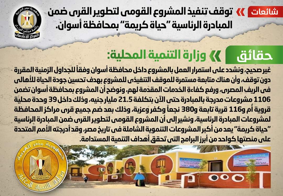 توضيح لشائعة: توقف تنفيذ المشروع القومي لتطوير القرى ضمن المبادرة الرئاسية “حياة كريمة” بمحافظة أسوان