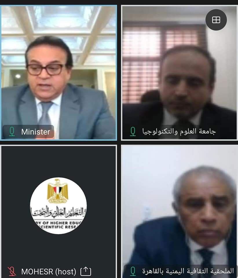 عقد د. خالد عبدالغفار وزير التعليم العالي والبحث العلمي، اليوم الثلاثاء، اجتماعًا مع د. خالد الوصابي وزير التعليم العالي والبحث العلمى اليمني، وذلك عبر تقنية الفيديو كونفرانس.