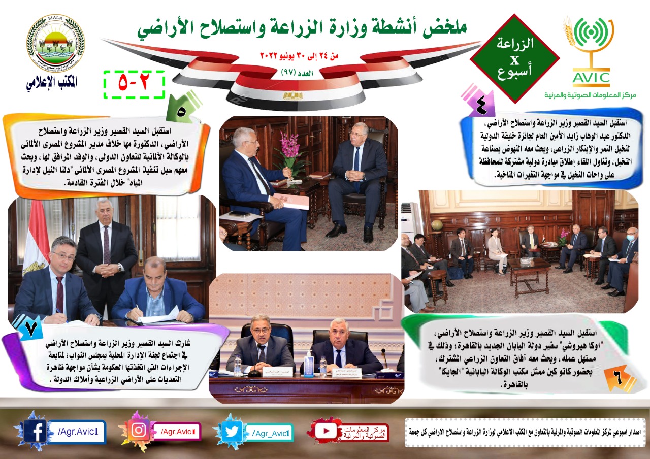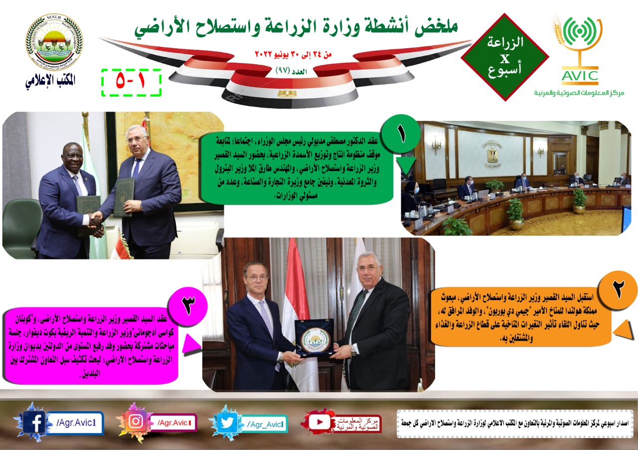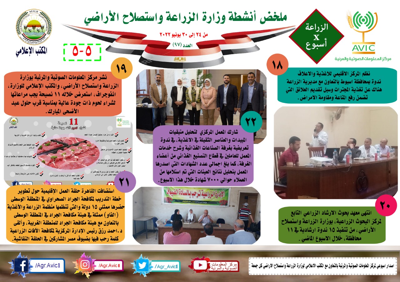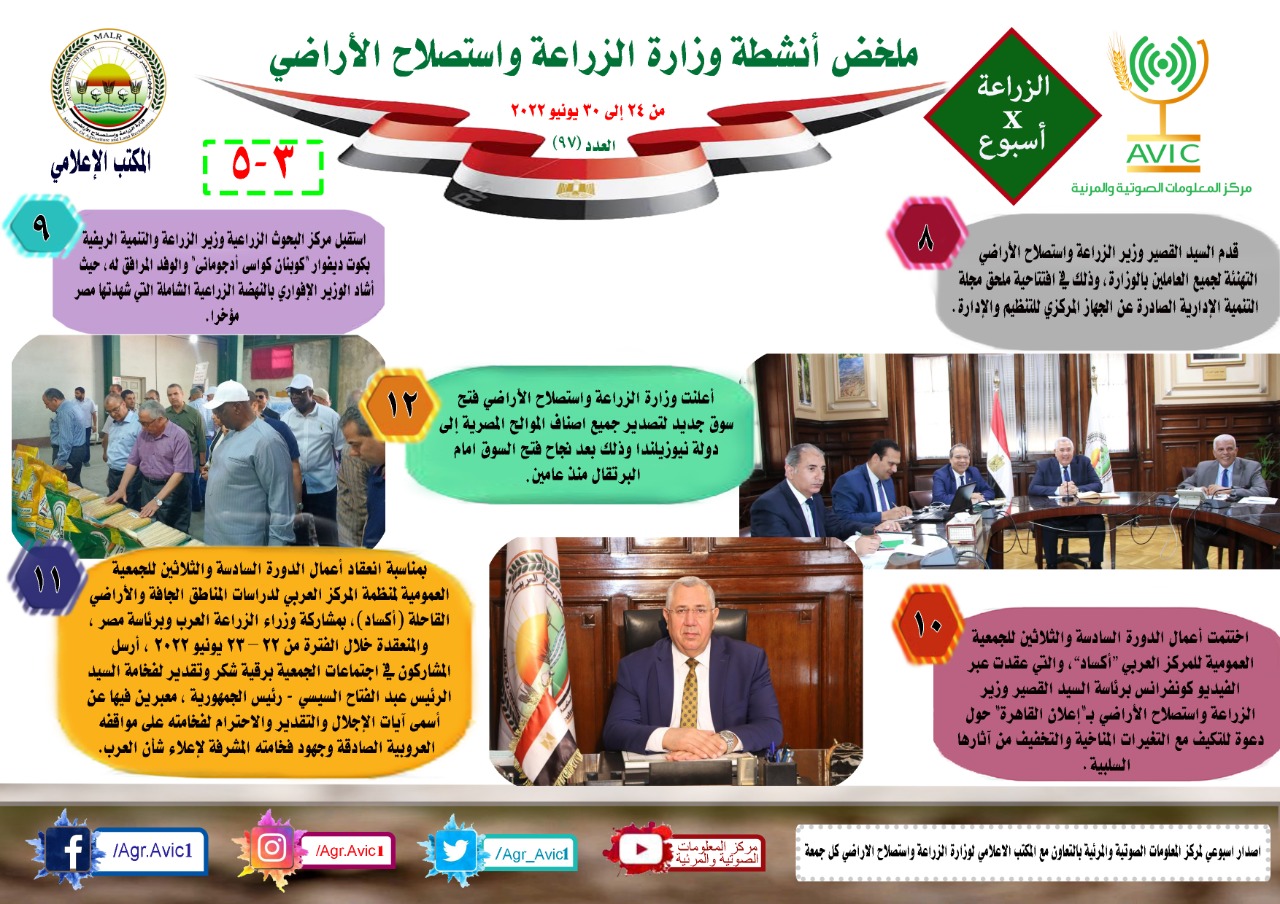 اصدر مركز المعلومات الصوتية والمرئية، التابع لوزارة الزراعة واستصلاح الاراضي، “الانفوجراف الاسبوعي” في نسخته رقم ٩٧ ، حول الحصاد الاسبوعي لأهم أنشطة الوزارة، خلال الاسبوع الماضي في الفترة من ٢٤ وحتى ٣٠ يونيو الجاري، وذلك بالتعاون مع المكتب الاعلامي للوزارة، كما أصدر المركز ايضا ملخصا بالفيديو، حول انشطة الوزارة خلال نفس الفترة