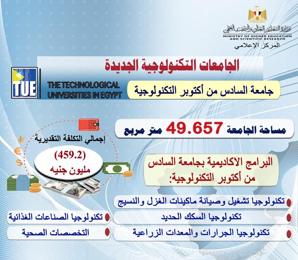 وأوضح المُتحدث الرسمي أن جامعة السادس من أكتوبر التكنولوجية ستُقدم برامج دراسية جديدة تخدم الصناعة بالمنطقة الجغرافية المحيطة بها، تشمل (تكنولوجيا تشغيل وصيانة ماكينات الغزل والنسيج – تكنولوجيا السكك الحديد- تكنولوجيا الجرارات والمعدات الزراعية – تكنولوجيا الصناعات الغذائية – التخصصات الصحية).