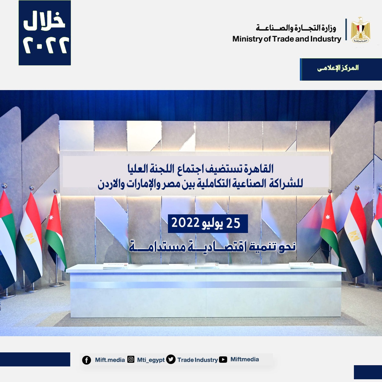 يترأسها وزراء الصناعة بالدول الثلاث القاهرة تستضيف إجتماع اللجنة العليا للشراكة الصناعية التكاملية بين مصر والامارات والاردن