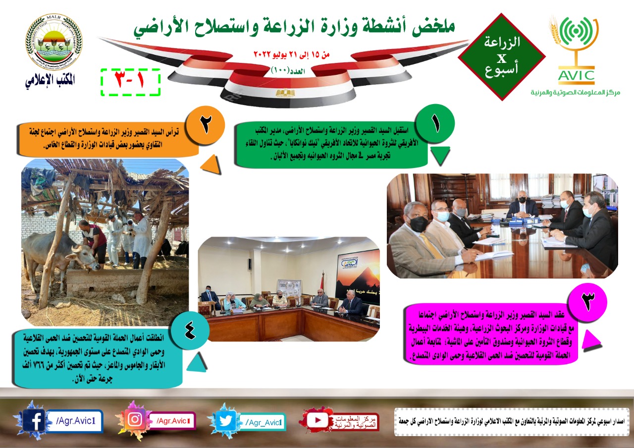 اصدر مركز المعلومات الصوتية والمرئية، التابع لوزارة الزراعة واستصلاح الاراضي، “الانفوجراف الاسبوعي” في نسخته رقم ١٠٠ ، حول الحصاد الاسبوعي لأهم أنشطة الوزارة، خلال الاسبوع الماضي في الفترة من ١٥ وحتى ٢١ يوليو الجاري، وذلك بالتعاون مع المكتب الاعلامي للوزارة، كما أصدر المركز ايضا ملخصا بالفيديو، حول انشطة الوزارة خلال نفس الفترة.