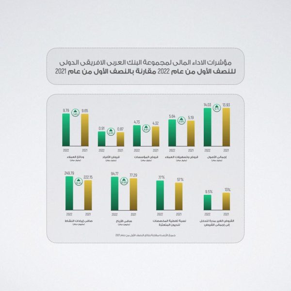 وقد شهدت كل مؤشرات الأداء للبنك العربي الأفريقي الدولي عن النصف الأول لعام 2022 نمواً ملحوظاً حيث حققت إدارة الائتمان عدة نجاحات، فقد شهد إجمالي القروض والتسهيلات الممنوحة للعملاء نموا بنسبة 8.8 % و الذي يعكس نمو القروض الممنوحة للمؤسسات بنسبة 9.6% و نمو القروض الممنوحة للأفراد بنسبة 4.5% علماً بأن جميع ارصدة القوائم المالية تترجم الي عملة العرض الأساسية للبنك و هي الدولار الأمريكي و بذلك يكون معدل النمو الحقيقي لإجمالي القروض و تسهيلات العملاء  23% و معدل النمو لقروض الشركات 23% و معدل النمو لقروض الافراد 24% ولإجمالي الأصول 9%  علي أساس ثبات سعر الصرف مما يدل على نجاح استراتيجية البنك في بناء قطاع ائتماني قادر على توفير التمويل اللازم للعديد من القطاعات الحيوية مع التوسع في قطاع التجزئة المصرفية و قطاع المشاريع الصغيرة و المتوسطة الذي بلغ حجم محفظته في يونيو 2022 مبلغ 9.4 مليار جم مقارنه ب 4.2 مليار جم في يونيو 2021 بزيادة قدرها 5.1 مليار جم محققة نسبة نمو124% .