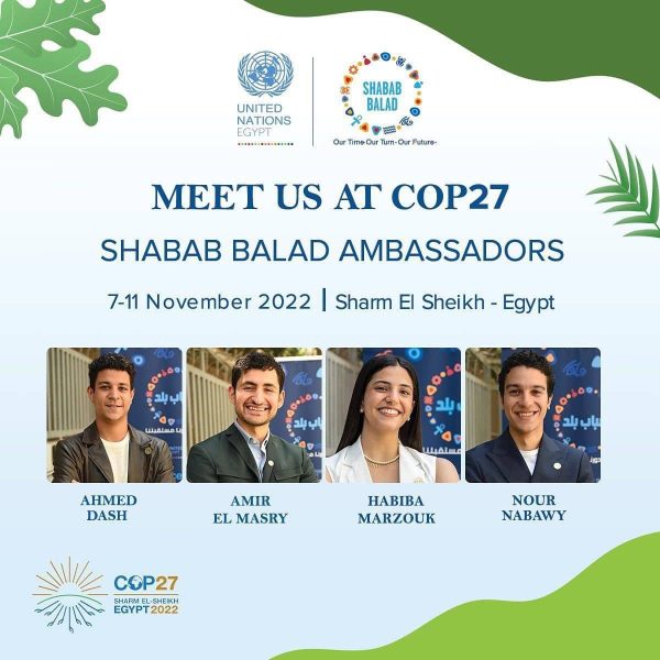 تشارك المبادرة العالمية للأمم المتحدة في مصر “شباب بلد” في الدورة 27 لمؤتمر الأمم المتحدة المعني بتغير المناخ في شرم الشيخ، ممثلة بعدد من سفراء المبادرة لتعزيز التوعية بقضايا التغير المناخي لدى الشباب، وإبراز دورهم المهم في التعامل مع قضية التغير المناخي، وتسليط الضوء على مشاريع شبابية ريادية لها علاقة بالمناخ.