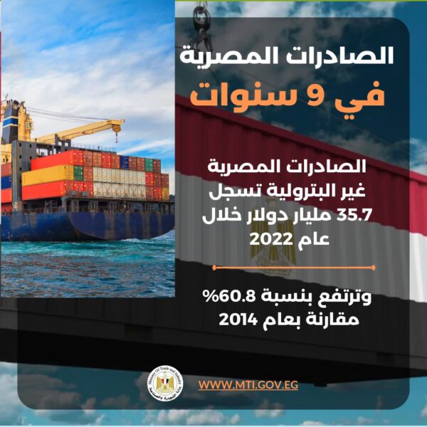 الصادرات المصرية غير البترولية تسجل 35.7 مليار دولار خلال عام 2022 وترتفع بنسبة 60.8% مقارنة بعام 2014
