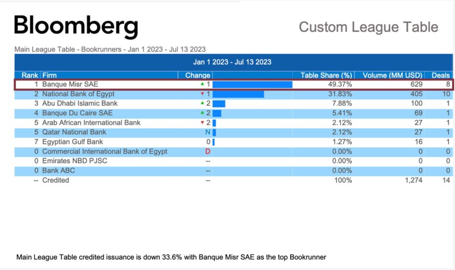 بنك مصر يحصل على المركز الأول على مستوى جمهورية مصر العربية في تسويق القروض المشتركة (Bookrunner) وفقاً لمؤسسة بلومبرج العالمية