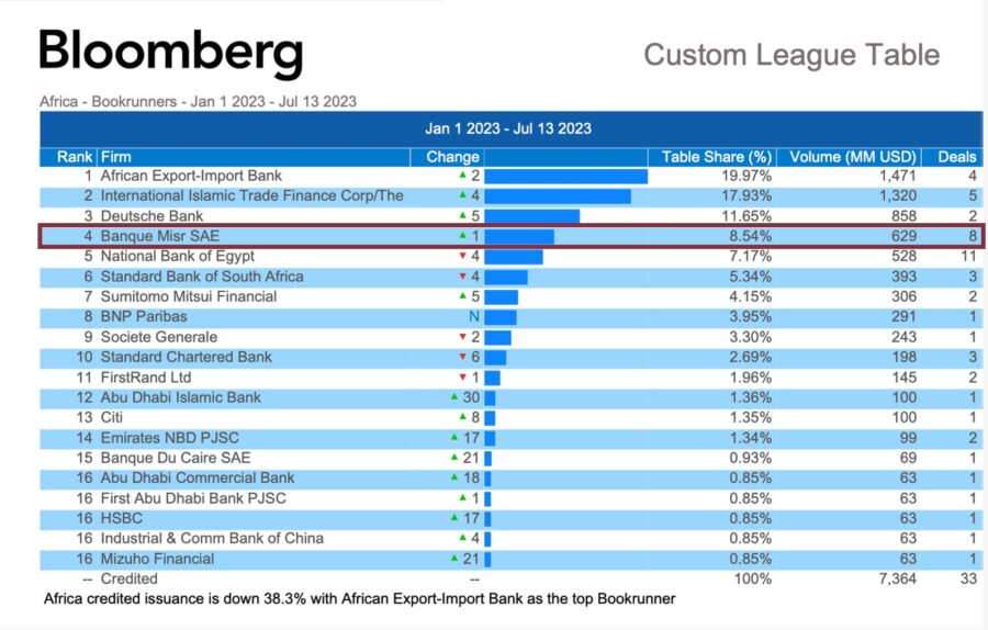 وبذلك يواصل بنك مصر الحفاظ على مركزه المتقدم على مستوى مصر وإفريقيا في مجال تسويق القروض المشتركة وتمويل المشروعات وفقاً للتقييم الذي تعده مؤسسة بلومبرج العالمية للبنوك، وتجدر الإشارة إلى أن الترتيب الحاصل عليه بنك مصر عن دوره كمسوق للقروض المشتركة (Bookrunner)؛ هو من الأدوار الأساسية في القروض المشتركة والتي تعتمد على الدراسة والتسويق وتعكس العلاقات الجيدة مع كلاً من العملاء التي يتم تسويق القروض لهم وكذا البنوك التي يتم دعوتها للمشاركة في تلك القروض، ويعد هذا تأكيداً للأداء المتميز للبنك ونتائجه المالية القوية واستمراراً للخطط التسويقية المكثفه التي ينتهجها بنك مصر لجذب عملاء وعمليات تمويلية جديدة وكذلك التزام البنك بتنفيذ أهدافه الإستراتيجية والتنموية بهدف دعم الاقتصاد القومي في شتى المجالات والقطاعات.