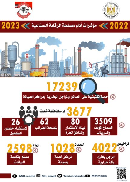 كشف أحدث تقرير تلقاه المهندس/ أحمد سمير وزير التجارة والصناعة حول مؤشرات أداء مصلحة الرقابة الصناعية خلال العام المالي 2022/2023 أن المصلحة قامت بإجراء 17239 حملة تفتيشية على المصانع والمراجل البخارية ومراكز الخدمة والصيانة، وإجراء 3677 دراسة فنية متخصصة تضمنت 3509 دراسة فنية في مجال السماح المؤقت والدر وباك، و80 دراسة لهيئة الاستثمار والمناطق الحرة، و62 دراسة لمصلحة الضرائب، و26 دراسة لاستخدام حصص الكحول.