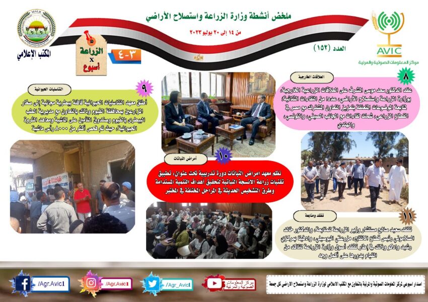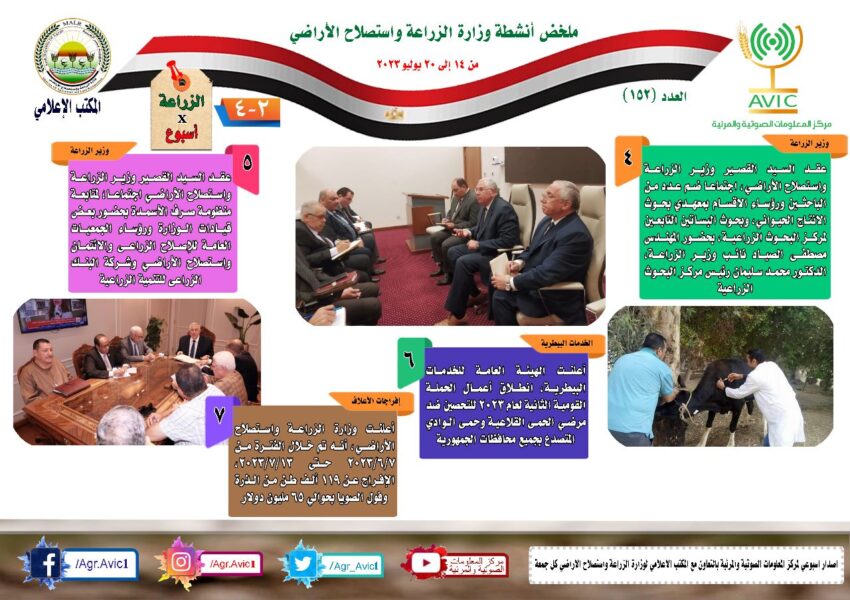 أصدر مركز المعلومات الصوتية والمرئية، التابع لوزارة الزراعة واستصلاح الاراضي، “الانفوجراف الاسبوعي” في نسخته رقم ١٥٢ ، حول الحصاد الاسبوعي لأهم أنشطة الوزارة، خ