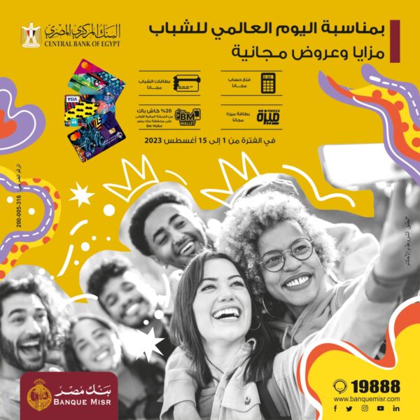 هذا ويتيح بنك مصر العديد من المنتجات والخدمات المالية المختلفة بمزايا وعروض مجانية بمناسبة ” اليوم العالمي للشباب ومنها؛ فتح حسابات للعملاء الجدد بدون مصاريف وبدون حد أدنى لفتح الحسابات، وإمكانية الحصول على بطاقة ميزة للخصم الفوري مجانا، بالإضافة الي استرداد 20% من الحركة المالية الأولي عند الاشتراك في محفظة بنك مصر الإلكترونية BM Wallet وتفعيلها خلال فترة الفاعلية، وفقا للشروط والأحكام المنظمة لذلك.