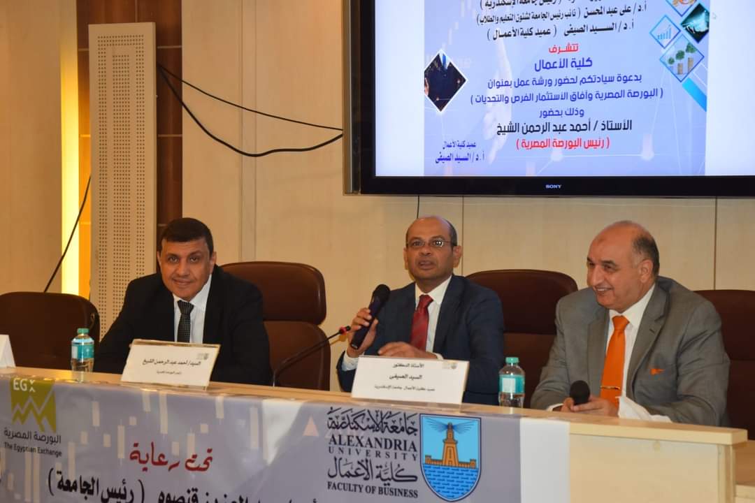 شارك أحمد الشيخ رئيس البورصة المصرية كمتحدث رئيسي في ورشة عمل نظمتها كلية الأعمال بجامعة الإسكندرية بعنوان “أسواق المال وآليات الاستثمار في بورصة الأوراق المالية المصرية” وذلك في إطار جهود نشر الوعي المالي والثقافة المالية بين الطلاب.