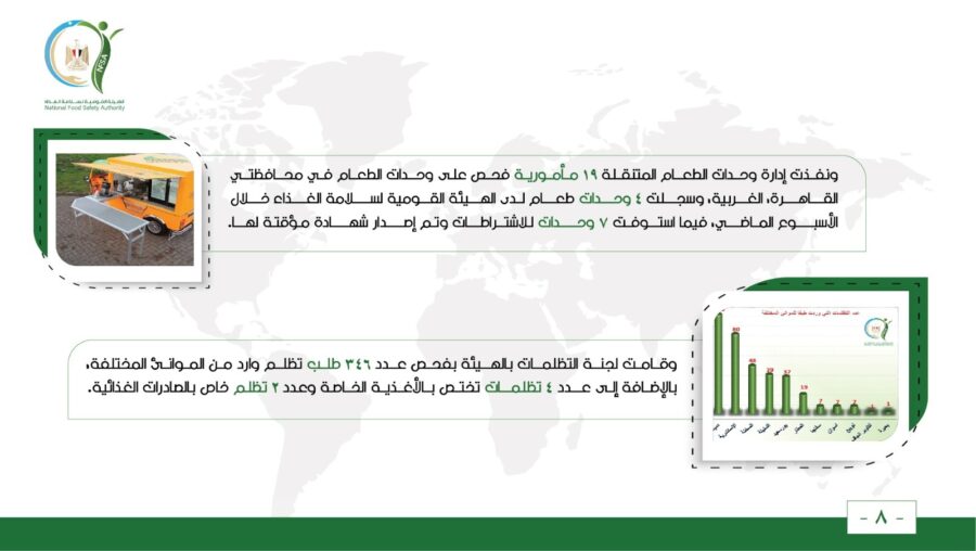وسجلت الإدارة العامة لتسجيل وترخيص الأغذية الخاصة 63 منتج و8 شركات، ونفذت 5 زيارات رقابية، كما فحصت الإدارة 400 منتج جديد، وأصدرت 19 شهادة بيع حر.