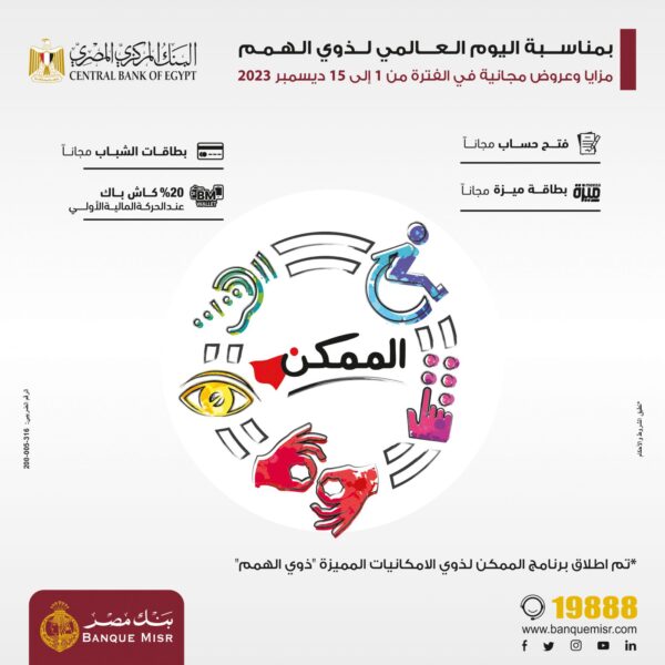 انطلاقاً من حرص بنك مصر على دعم جهود الدولة في تحقيق الشمول المالي، واتساقاً مع رؤية مصر 2030 لتحقيق التنمية المستدامة، يقوم البنك بتقديم العديد من المزايا والعروض المجانية لعملائه وبخاصة المرأة والشباب، كونهم الفئة الأكبر في المجتمع، بمناسبة” اليوم العالمي لذوي الهمم ” تحت رعاية البنك المركزي المصري خلال الفترة من 1 الي 15 ديسمبر 2023، ويأتي ذلك إيماناً منه بأهمية تحقيق الشمول المالي الذي يهدف إلى تمكين كافة شرائح المجتمع من الوصول إلى المنتجات والخدمات المالية التي تلبي احتياجاتهم المختلفة، ومنها على سبيل المثال؛ حسابات التوفير، والحسابات الجارية، وخدمات الدفع والتحويل، والتأمين، والتمويل والائتمان.