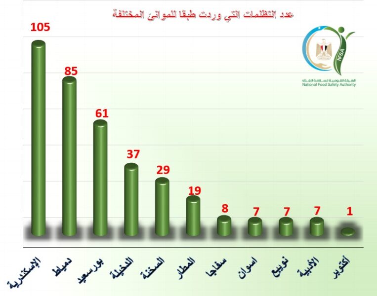 وتصدر ميناء الإسكندرية الأسبوع الماضي أيضًا المركز الأول في عدد الرسائل الغذائية الواردة إليه بإجمالي 460 رسالة، يليه ميناء مطار القاهرة والذي احتل المركز الثاني بـ 288 رسالة، ثم ميناء دمياط بإجمالي 280 رسالة.