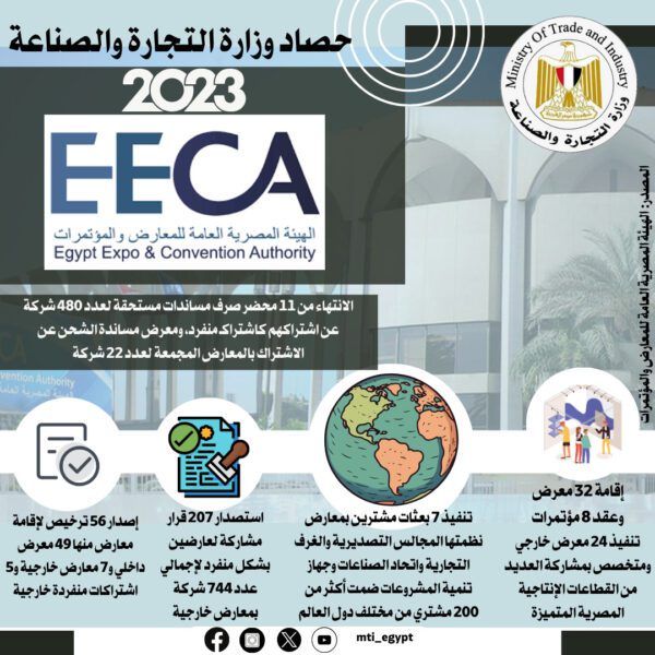 وأشار إلي دور الهيئة المصرية للمعارض والمؤتمرات في إقامة 32 معرض وعقد 8 مؤتمرات وإصدار 56 ترخيص لإقامة معارض منها 49 معرض داخلي و7 معارض خارجية و5 اشتراكات منفردة خارجية. وكذا تنفيذ 24 معرض خارجي ومتخصص بمشاركة العديد من القطاعات الإنتاجية المصرية المتميزة واستصدار 207 قرار مشاركة لعارضين بشكل منفرد لإجمالي عدد 744 شركة بمعارض خارجية تمثل كافة القطاعات التصديرية المتنوعة. وتنفيذ 7 بعثات مشترين بمعارض نظمتها المجالس التصديرية والغرف التجارية واتحاد الصناعات وجهاز تنمية المشروعات ضمت أكثر من 200 مشتري من مختلف دول العالم.