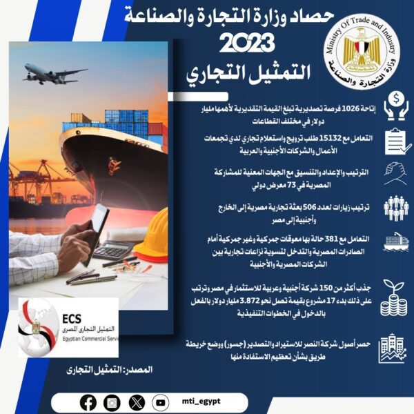 وقال إن جهاز التمثيل التجاري ساهم في تنمية الصادرات المصرية من خلال جهود المكاتب الخارجية في الترويج للمنتجات المصرية. من خلال إتاحة 1026 فرصة تصديرية تبلغ القيمة التقديرية لأهمها مليار دولار في مختلف القطاعات.و التعامل مع 15132 طلب ترويج واستعلام تجاري لدي تجمعات الأعمال والشركات الأجنبية والعربية.