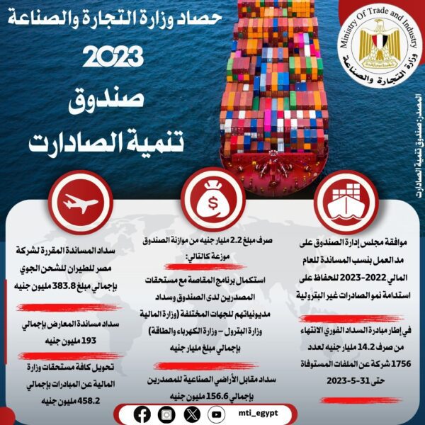 وانه في إطار مبادرة السداد الفوري تم الانتهاء من صرف 14.2 مليار جنيه لعدد 1756 شركة عن الملفات المستوفاة حتى 31-5-2023.وكذا صرف مبلغ 2.2 مليار جنيه من موازنة الصندوق موزعة كالتالي: استكمال برنامج المقاصة مع مستحقات المصدرين لدى الصندوق وسداد مديونياتهم للجهات المختلفة (وزارة المالية- وزارة البترول – وزارة الكهرباء والطاقة) بإجمالي مبلغ مليار جنيه.