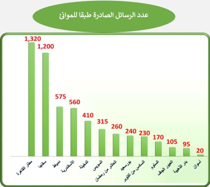 وتصدر ميناء الإسكندرية الأسبوع الماضي أيضًا المركز الأول في عدد الرسائل الغذائية الواردة إليه بإجمالي 410 رسالة، يليه ميناء مطار القاهرة والذي احتل المركز الثاني بـ 300 رسالة، ثم ميناء دمياط بإجمالي 252 رسالة.