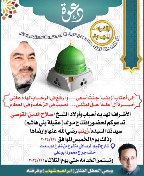 تدعو ( الاشراف المهدية ) احباب واولاد الشيخ صلاح الدين القوصى لحضور افتتاح مولد ” عقيلة بنى هاشم ” سيدتنا السيدة زينب رضى الله عنها وأرضاها وذلك يوم الخميس الموافق الاول من فبراير 2024 ش تميم الرصافى متفرع من شارع بورسعيد
