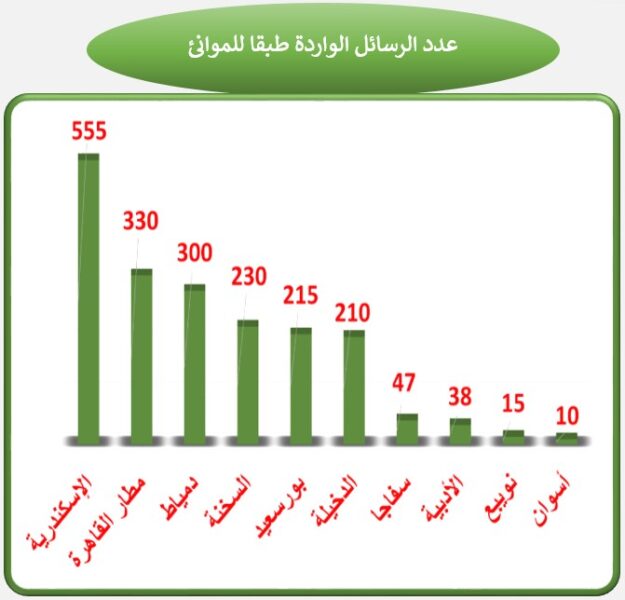 وتصدر ميناء الإسكندرية المركز الأول في عدد الرسائل الغذائية الواردة إليه بإجمالي 555 رسالة، يليه ميناء مطار القاهرة والذي احتل المركز الثاني بـ 330 رسالة، ثم ميناء دمياط بإجمالي 300 رسالة.