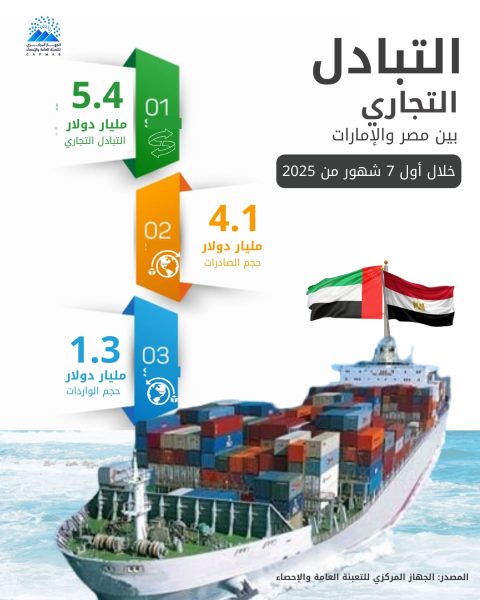 كما أظهرت بيانات الجهاز عن ارتفاع قيمة التبادل التجاري بين مصر والإمارات لتصل إلى 5.4 مليار دولار من يناير حتى يوليو 2025 مقابل 3.2 مليار دولار خلال نفس الفترة من عام 2024 بنسبة ارتفاع قدرها 71 % .
