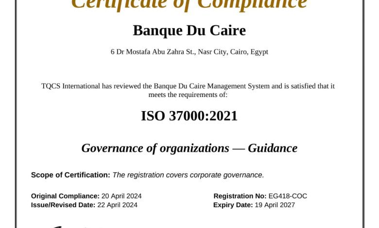 تأكيداً لريادته في تطبيق أفضل معايير الحوكمة المؤسسية، أعلن بنك القاهرة تمديد اعتماد شهادة الأيزو في مجال الحوكمة المؤسسية ISO 37000 للعام الثاني على التوالي، تتويجاً لجهوده المتواصلة في مواءمة أنظمته وإجراءاته مع المعايير الدولية المعتمدة.
