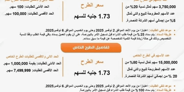 يبلغ سعر الطرح لكل من الطرح العام والخاص 1.73 جنيه للسهم، على أن يتم فتح باب الاكتتاب من الأحد 2 نوفمبر وحتى الخميس 6 نوفمبر 2025.