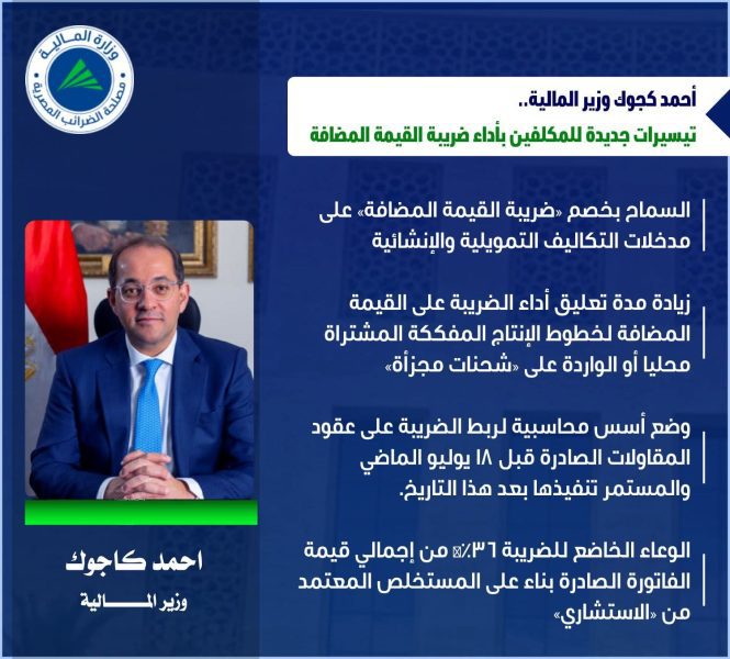 وزير المالية: تيسيرات جديدة للمكلفين بأداء ضريبة القيمة المضافة