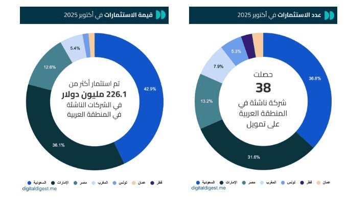 شهد شهر أكتوبر نشاطًا استثماريًا قويًا في قطاع الشركات الناشئة بمنطقة الشرق الأوسط وشمال أفريقيا، حيث بلغ إجمالي التمويلات 226.1 مليون دولار موزعة على 38 شركة ناشئة، تصدرتها جولة تمويلية بقيمة 50 مليون دولار لشركة «UnifyApps» التي تتخذ من الإمارات مقرًا رئيسيًا لها.
