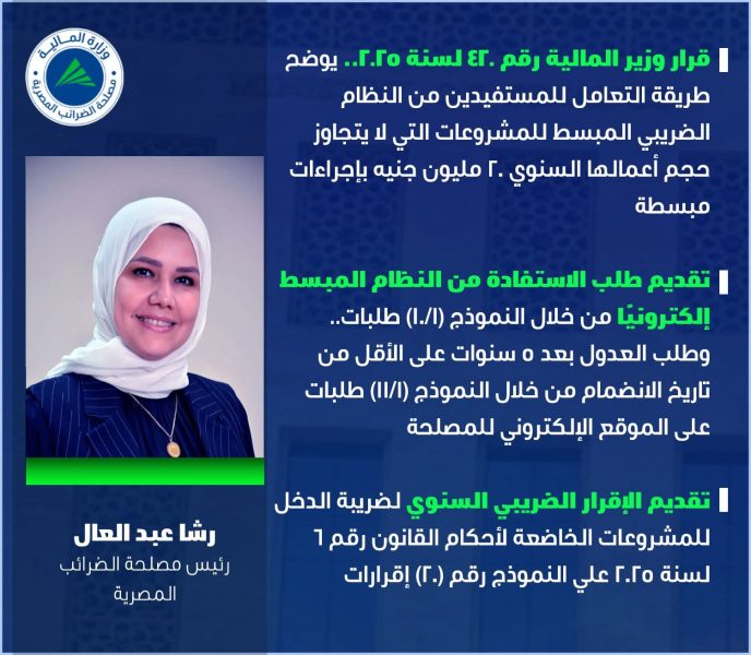 في إطار المزيد من التوضيح والتسهيل على شركائنا الممولين/المكلفين المعنيين بالاستفادة من النظام الضريبي المسبط.. أكدت رشا عبد العال رئيس مصلحة الضرائب المصرية، أن وزير المالية أصدر القرار رقم 420 لسنة 2025، بشأن توضيح بعض آليات التعامل للمستفيدين من النظام الضريبي المبسط للمشروعات التي لا يتجاوز حجم أعمالها السنوي 20 مليون جنيه وفقًا للقانون رقم 6 لسنة 2025، موضحةً أن الالتزامات المترتبة على هذا القرار بسيطة وميسرة، حيث تم مراعاة ألا تشكل عبئًا أو عائقًا أمام أصحاب المشروعات الراغبين في الانضمام للنظام.