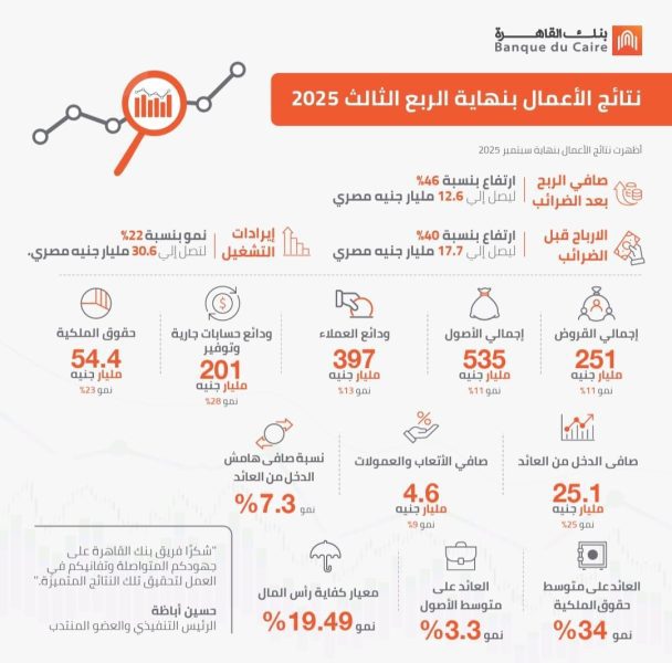 نتائج أعمال بنك القاهرة بنهاية سبتمبر 2025.. نمو إيرادات التشغيل بنسبة 22% لتصل إلى 30.6 مليار جنيه مصري. وارتفاع صافي الربح بنسبة 46% ليصل إلى 12.6 مليار جنيه مصري
