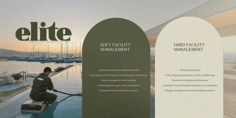 إدارة المرافق الخدمية (Soft FM): التنظيف والضيافة، الأمن والمراقبة، إدارة النفايات وإعادة التدوير، تنسيق الحدائق، وخدمات الاستقبال والدعم الإداري.