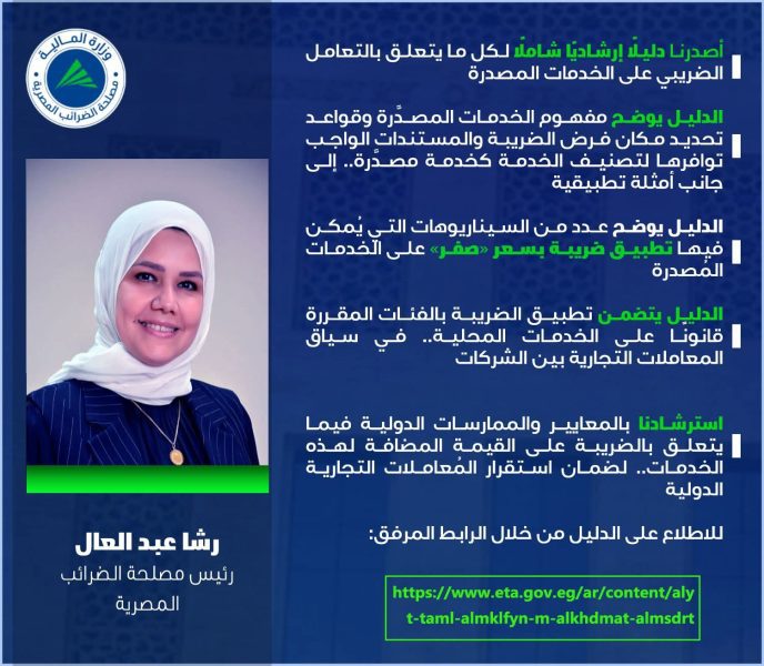 قالت رشا عبد العال رئيس مصلحة الضرائب المصرية، إننا أصدرنا دليلًا إرشاديًا شاملًا لكل ما يتعلق بالتعامل الضريبي على الخدمات المُصدَّرة؛ بهدف توضيح: مفهوم الخدمات المصدَّرة في ضوء قانون الضريبة على القيمة المضافة ولائحته التنفيذية، وتوضيح قواعد تحديد مكان فرض الضريبة، والمستندات الواجب توافرها لتصنيف الخدمة كخدمة مصدَّرة، مشيرةً إلى أن الدليل يحتوي على أمثلة تطبيقية توضّح كيفية تطبيق المعاملة الضريبية لعدد من حالات الخدمات المصدرة الأكثر شيوعًا.