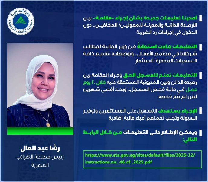 صرحت رشا عبد العال رئيس مصلحة الضرائب المصرية، أن المصلحة أصدرت التعليمات رقم (46) لسنة 2025 بشأن إجراءات المقاصة بين الأرصدة الدائنة والمدينة للمسجلين/ الممولين وفقاً لأحكام المادة (50) من القانون رقم (206) لسنة 2020، مشيرةً إلى أن التعليمات جاءت استجابةً من وزير المالية لمطالب شركائنا في مجتمع الأعمال، وتوجيهاته المستمرة بالوقوف على التحديات التي تواجههم والعمل على إيجاد الحلول وتقديم كافة التسهيلات المحفزة للاستثمار.