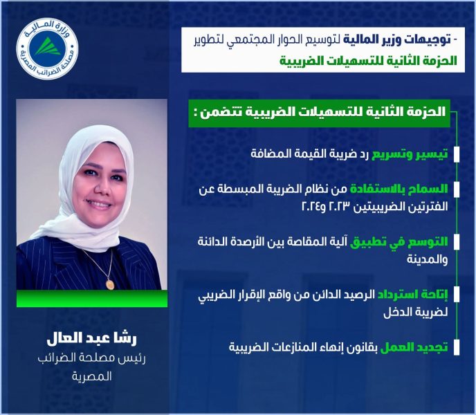 رشا عبد العال : توجيهات وزير المالية أحمد كجوك لتوسيع الحوار المجتمعي لتطوير الحزمة الثانية للتسهيلات الضريبية