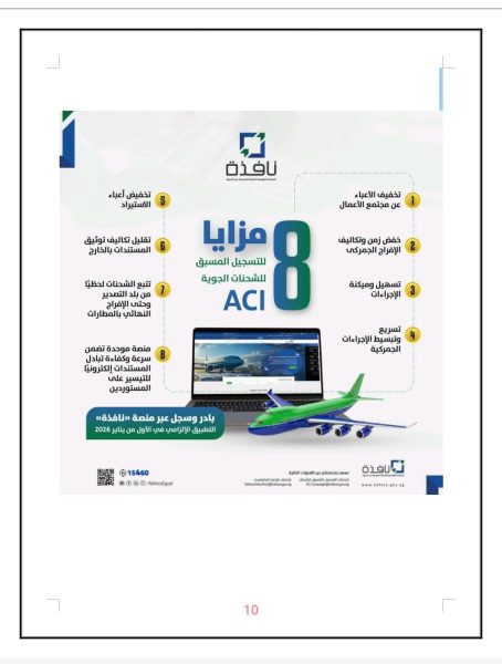 تقوم برفع بيانات المانيفست الإلكتروني إلى منصة «نافذة» فور الإقلاع للرحلات القصيرة التي تستغرق أقل من 4 ساعات، أو خلال ساعتين كحد أقصى لباقي الرحلات.