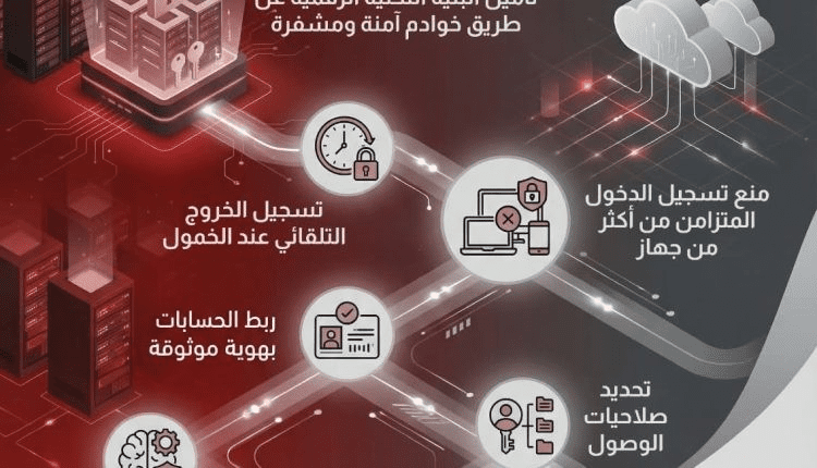 وأكد البيان أهمية تأمين البنية التحتية الرقمية من خلال استخدام خوادم آمنة ومشفرة، وتطبيق سياسات واضحة لإدارة الدخول إلى الأنظمة. بما يشمل منع تسجيل الدخول المتزامن للحساب الواحد من أكثر من جهاز، وتفعيل آليات تسجيل الخروج التلقائي عند الخمول، وربط الحسابات بهويات موثوقة.