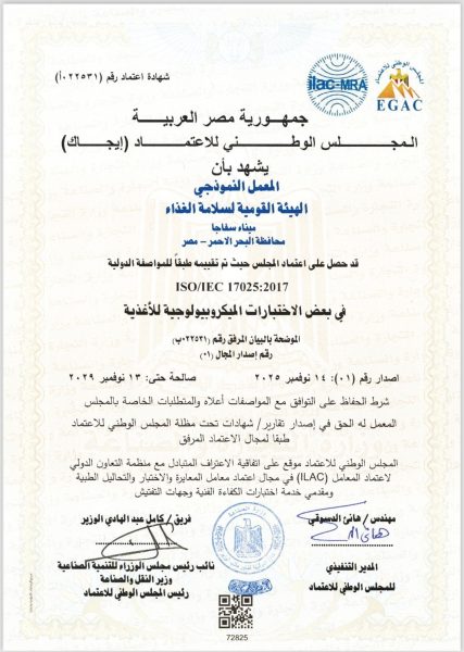 أعلنت الهيئة القومية لسلامة الغذاء عن حصول معمل سفاج التابع لها على الاعتماد من قبل المجلس الوطني للاعتماد إيجاك – ( وفقًا للمواصفة الدولية ISO/IEC 17025 :2017 ) الخاصة بكفاءة معامل الفحص والاختبار، وذلك في إطار جهود الدولة المستمرة لتطوير منظومة سلامة الغذاء ورفع كفاءة البنية التحتية للمعامل.