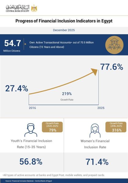 أسفرت جهود البنك المركزي المصري والقطاع المالي، عن مواصلة معدلات الشمول المالي في مصر ارتفاعها لتصل إلى 77.6% بنهاية 2025، ليصبح عدد المواطنين الذين يمتلكون حسابات نشطة تمكنهم من إجراء معاملات مالية 54.7 مليون مواطن من إجمالي 70.5 مليون مواطن في الفئة العمرية من 15 سنة فأكثر، وبمعدل نمو بلغ219 % خلال الفترة من 2016 إلى 2025.