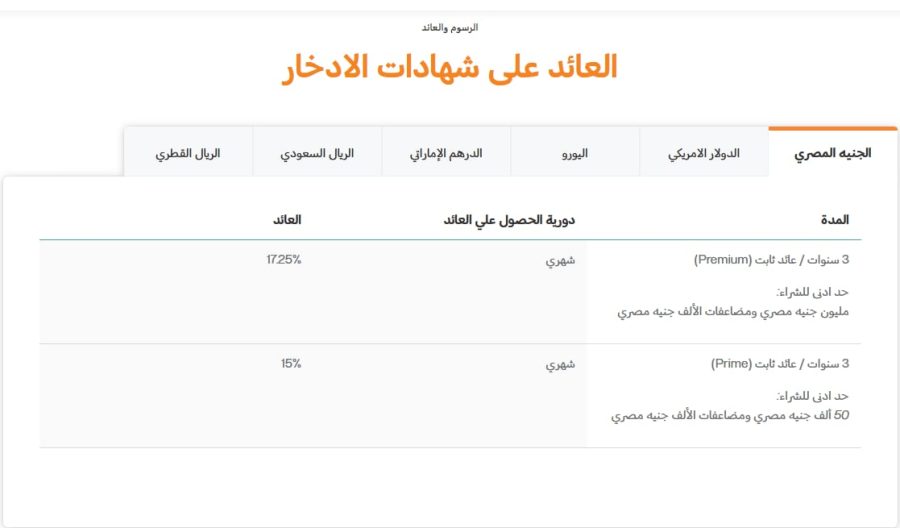 – شهادة Premium (مدة 3 سنوات – عائد شهري): تم تخفيض الحد الأدنى من 5 ملايين جنيه ليصبح 1 مليون جنيه، بعائد شهري 17.25%.
