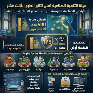 هيئة التنمية الصناعية تعلن نتائج الطرح الثالث عشر للأراضي الصناعية المرفقة عبر منصة مصر الصناعية الرقمية