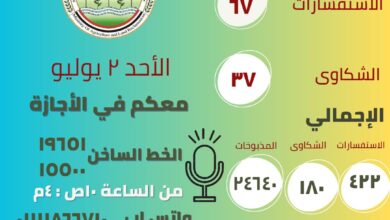 الزراعة” تواصل العمل في سادس ايام الاجازة.. غرفة عمليات “الزراعة” تستقبل ٦٧ استفسار و ٣٧ شكوى